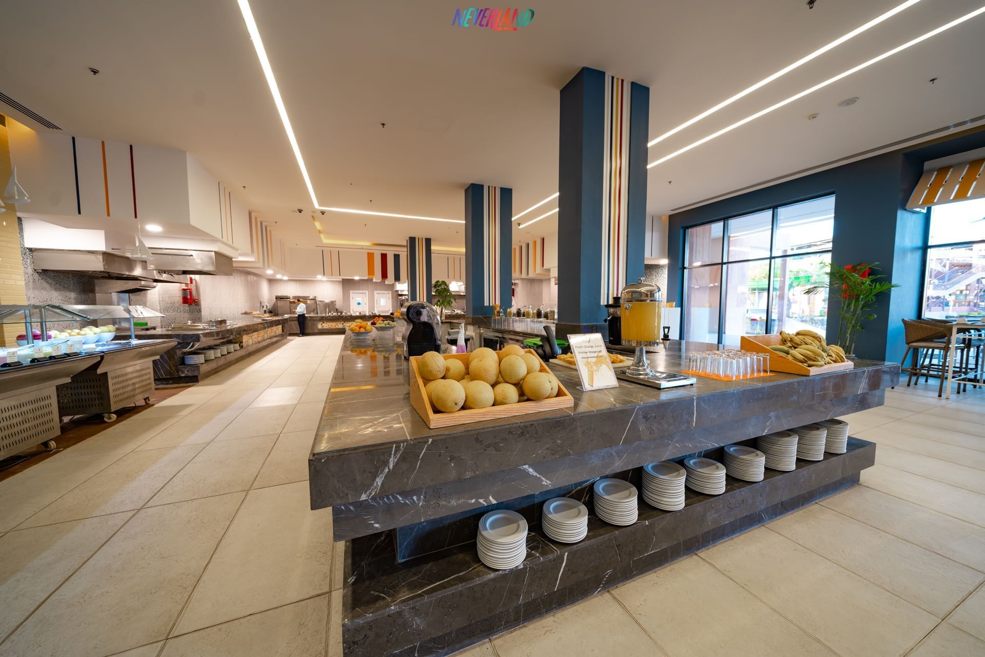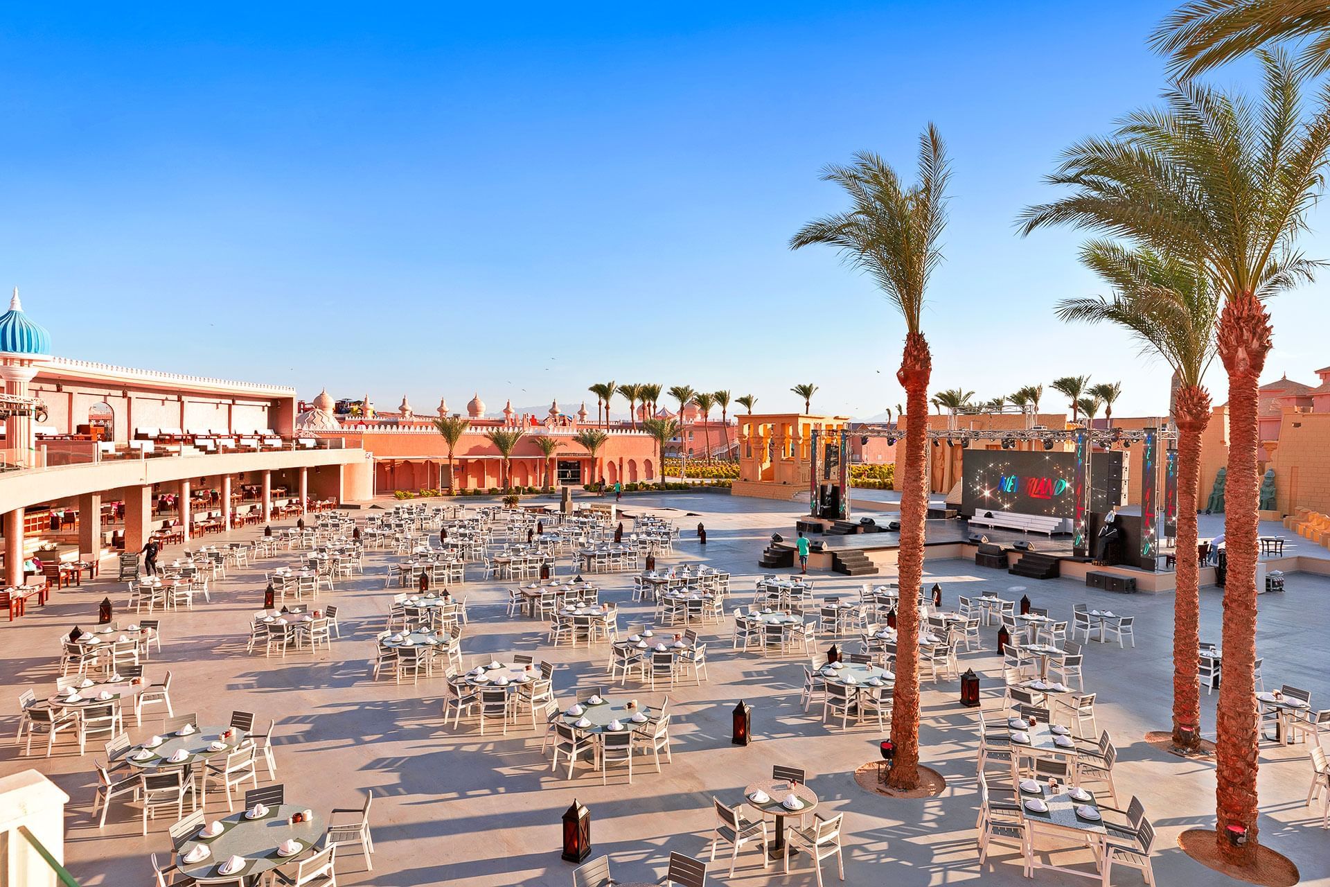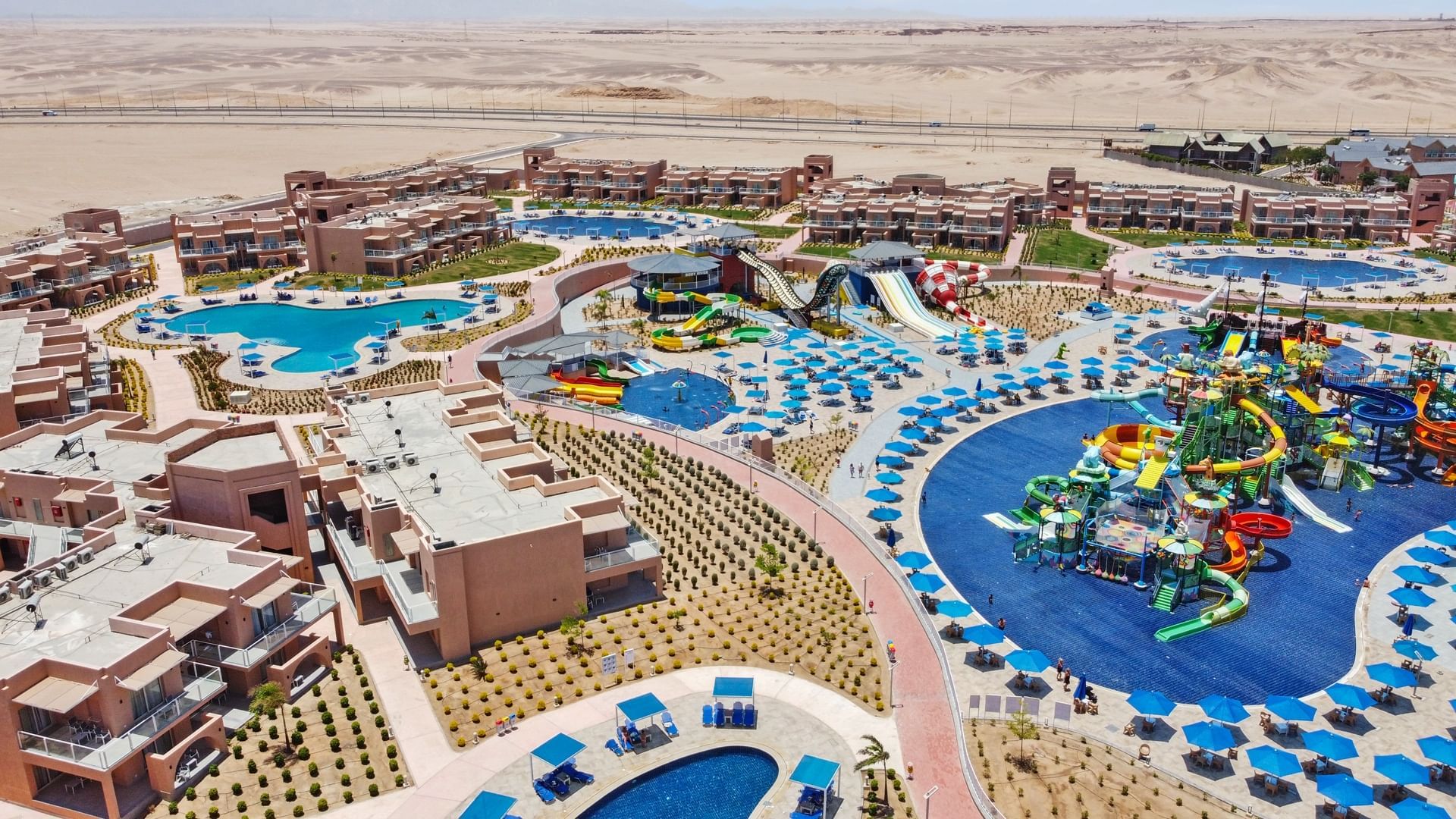 The hotel Pickalbatros Jungle Aqua Park Resort Neverland Hurghada is located approximately 900 m from a beach. The city centre is around 25 km away. There is a shuttle between the hotel and the airport (for a fee). The beach is patrolled by a lifeguard. Here, there are cushions, sun umbrellas and beach towels available. At the beach there is a bar serving refreshing drinks. To reach the beach a shuttle is provided. The air-conditioned hotel has a 24h reception (check-in is possible around the clock), a lobby, Wi-Fi, internet access, a lift, a supermarket and other shops, a boutique, cash machine, a hairdresser, a jacuzzi, showers and changing rooms, a first aid kit as well as parking spaces. In the outdoor area of the property you will find a garden as well as a seasonally heated pool (open all year), where sun loungers, sun umbrellas and pool towels are available for free. There is also a separate children's pool with 35 water slides. Furthermore, you can relax outdoors on a terrace. For your entertainment, the hotel offers a cinema, a theatre and a disco. For the young hotel guests there is a playground. For very young guests, kid`s chairs can also be provided. You can store your luggage in the hotel's storage room. There is also a laundry service available at an additional cost to customers. For your comfort, in addition to the concierge service the hotel page will ensure you are looked after. If necessary, you can contact the medical centre at any time (for a fee). Guests at the accommodation can get a wake-up call from the hotel personnel. At the reception, tickets are offered for excursions in the area. Due to its barrier-free facilities , such as separate, barrier-free entrances and wheelchair accessible rooms, the hotel is also suitable for wheelchair users. Catering As catering services the hotel offers all-inclusive, full board and self-catering. Breakfast is offered from the buffet. Enjoy your lunch from the buffet. Dinner is also served as a buffet, as a set meal or à la carte. For the meals, there are a buffet restaurant (Italian, calorie-reduced and vegetarian dishes) and several bars as well as a 24h snackbar. Appropriate clothing is required for lunch and dinner. Distances
